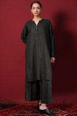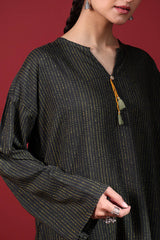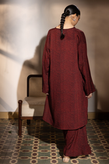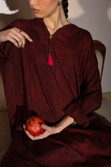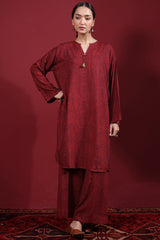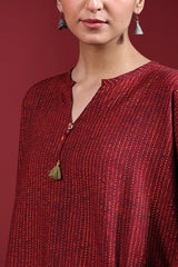 A relaxed-fit printed shirt with a round neckline and V-slit, adorned with tassel detailing. Features drop shoulders for an easy silhouette. Paired with matching printed culottes.