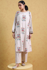 Embroidered paneled classic-fit shirt with a round neckline adorned with crochet detailing. Paired with straight-fit trousers.