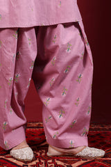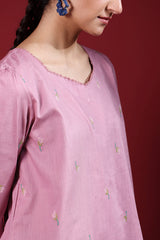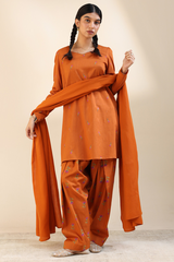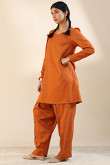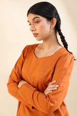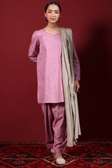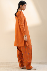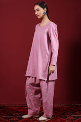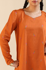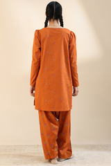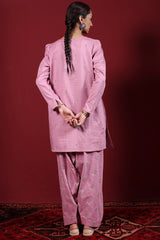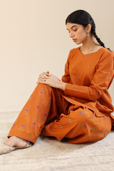 Embroidered classic-fit A-line shirt adorned with delicate crochet lace detailing along the neckline. Features soft puff sleeves for a graceful finish. Paired with an embroidered classic-fit shalwar accented with stitching detail along the ankle hemline.