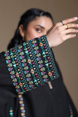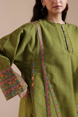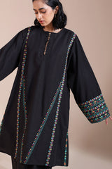 Embroidered paneled kurta with a round neckline adorned with pleat detailing and buttons along the front slit. Paired with a classic-fit shalwar for an elegant, cohesive look.