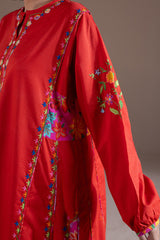Hand-embroidered paneled shirt with a round neckline and V-slit, adorned with delicate embroidered detailing. Designed with cuffed sleeve hems. Paired with classic culottes finished with subtle stitching detail along the hemline.
