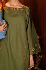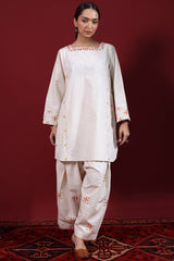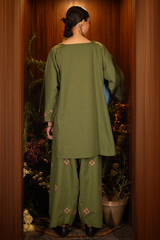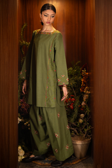 Hand-embroidered paneled shirt with a square neckline and a round shirt hem, elevated with delicate floral hand embroidery. Paired with a matching hand-embroidered farshi shalwar for a graceful, traditional finish.