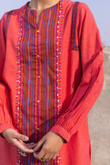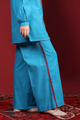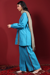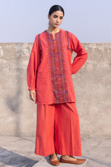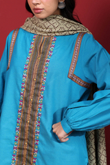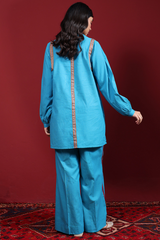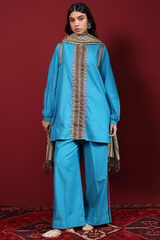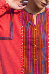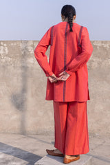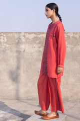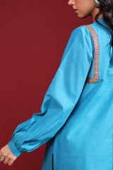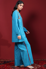 Hand-embroidered classic-fit kurta with a round neckline and buttoned front slit, finished with delicate embroidered detailing and cuffed sleeves adorned with subtle button accents. Paired with classic culottes.