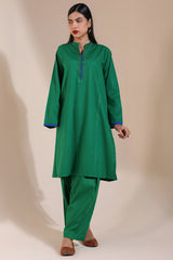 Hand-embroidered paneled kurta featuring a low band neckline, adorned with delicate stitching details and loop accents along the front slit. Paired with a classic-fit shalwar.