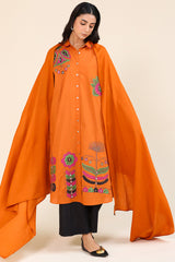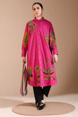 Embroidered shirt with a collar neckline and a button-down front, finished with delicate stitching along the neckline. Designed with drop shoulders and cuffed sleeves for a relaxed look. The embroidered motifs are enhanced with subtle sequin detailing for a refined touch.