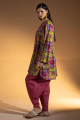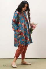 Relaxed-fit printed shirt with a round neckline and V-slit, finished with a rounded hem. Paired with a coordinated printed tulip-style shalwar for an easy, refined look.