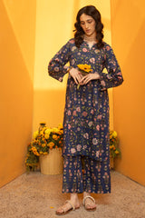 Classic-fit printed shirt featuring delicate mukaish detailing along the neckline, designed in an easy silhouette with subtle drop shoulders and a rounded hem. Paired with classic printed culottes.