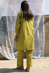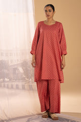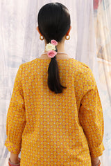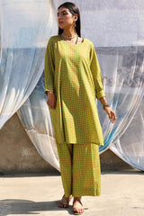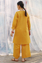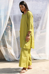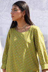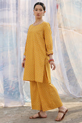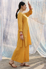 Classic-fit printed shirt with delicate stitching detail along the neckline and cuffed sleeve hems. Paired with matching printed culottes.