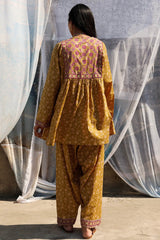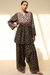 Printed short gathered shirt with a round neckline and V-slit, adorned with delicate sequin detailing along the bodice and sleeve hems. Paired with matching printed farshi shalwar for a flowing look.
