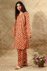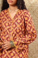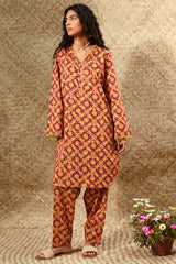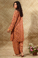 Printed classic-fit shirt with a V-neckline, adorned with delicate fringe detailing along the neckline and sleeve hems. Featuring side pockets and finished with a round hem. Paired with matching printed classic-fit shalwar.