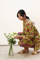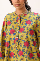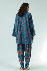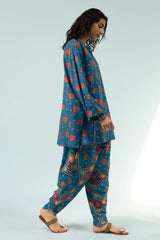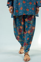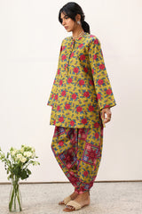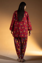 Floral printed relaxed-fit shirt with a low band neckline and buttoned front placket. Paired with a coordinated printed tulip shalwar for a cohesive look.