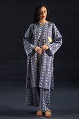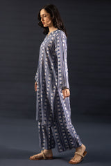 Classic-fit printed shirt with a round neckline and V-slit, adorned with delicate crochet lace detailing. Paired with matching printed culottes.