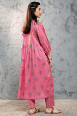 Printed gathered dress with a round neckline and buttons along the front placket. Designed with cinched sleeve hems and drop shoulders. Gathers at the empire waist create a softly flared silhouette. Paired with coordinated printed straight-fit trousers.