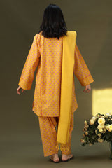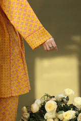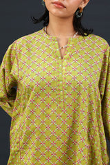 Printed paneled kurta with a round neckline and an overlap placket, accented with subtle lace detailing along the panels and sleeves. Paired with a matching printed classic-fit shalwar.