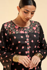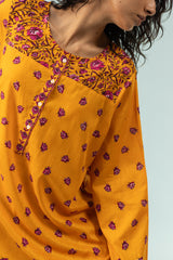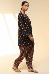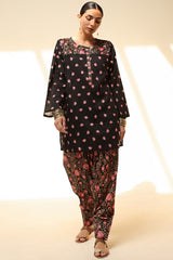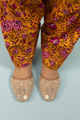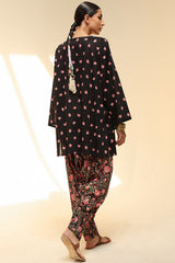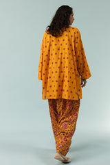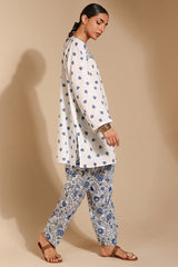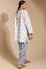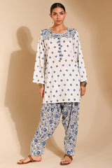 Classic-fit printed shirt designed with a round neckline and a buttoned front placket, accented with delicate pleats at the shoulders. Paired with a coordinating printed pegged shalwar.