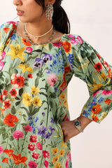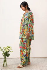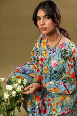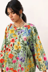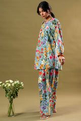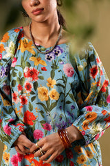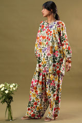 Floral printed boxy-fit shirt with subtly gathered shoulders and cuffed sleeve hems. Finished with a round hem. Paired with matching printed farshi shalwar.
