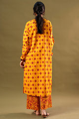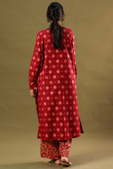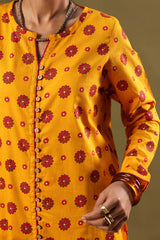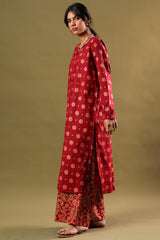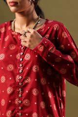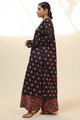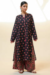 Printed classic-fit shirt with a round neckline and loop buttons along the front slit. Button and slit detailing accent the sleeve hems. Paired with coordinated printed culottes.