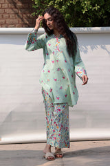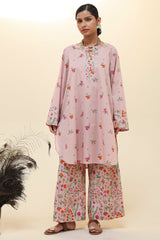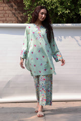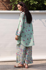 Classic-fit printed shirt with a round neckline and V-slit, adorned with delicate sequin detailing. Finished with a rounded shirt hem. Paired with coordinated printed culottes.