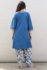 Classic fit paneled shirt with a V-neckline, adorned with delicate embroidered detailing along the neckline and sleeve hems. Paired with a coordinated printed classic fit shalwar.