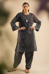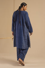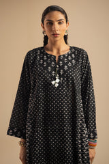 Classic-fit paneled printed shirt with a round neckline and V-slit, adorned with tassel detailing along the front slit. Designed for a comfortable, easy silhouette. Paired with a coordinated printed classic-fit shalwar.