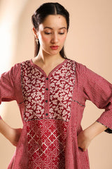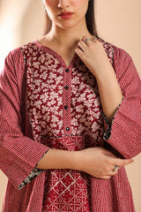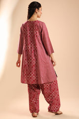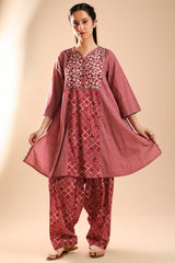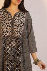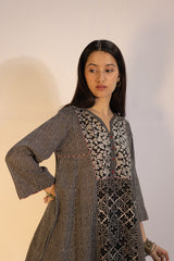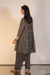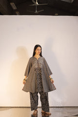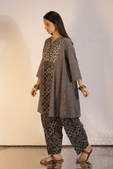 Relax-fit paneled kurta with button detailing along the front slit. Paired with a coordinated printed khula poncha shalwar.