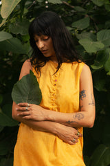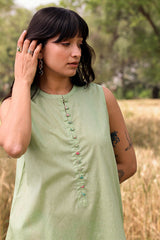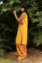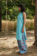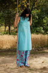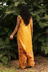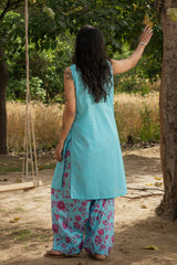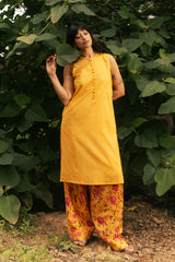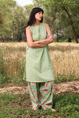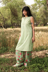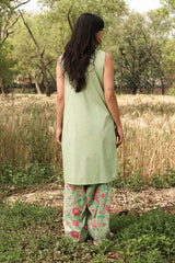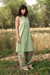 Classic-fit sleeveless shirt with a low band neckline and loop button detailing along the front slit. Paired with a floral-printed farshi shalwar, finished with stitching details along the borders.