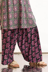 Classic-fit printed shirt with a low band neckline and buttoned front placket. Sleeve hems adorned with delicate lace detailing, finished with subtle drop shoulders and a rounded hem. Paired with a coordinated printed farshi shalwar.