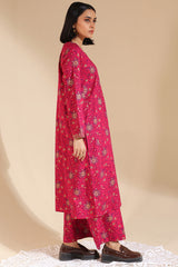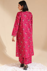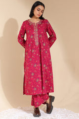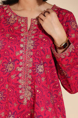 A printed A-line shirt with a round neckline and V-slit, adorned with delicate embroidery on the neckline and sleeve hems. Paired with matching printed culottes for a coordinated look.