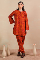 A deep classic-fit printed shirt with a round neckline and V-slit, adorned with tasseled detailing. Paired with matching printed classic-fit shalwar for a coordinated, stylish look.
