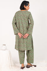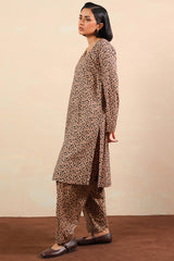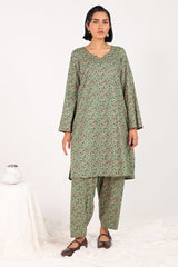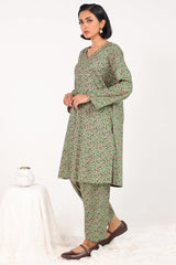 A relaxed-fit vibrant printed shirt with a round neckline and V-slit, featuring cuffed sleeves. Paired with matching printed classic-fit shalwar for a coordinated, stylish look.