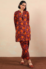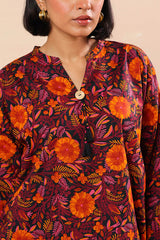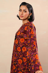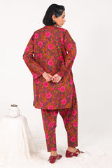A regular-fit printed shirt with a low-band neckline and V-slit, adorned with button and tassel detailing. Paired with matching printed pegged shalwar featuring stitched detailing on the ankle hemline for a coordinated, stylish look.