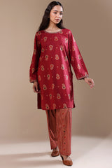 Gold-printed classic-fit shirt adorned with delicate embroidered detailing along the neckline and sleeve hems. Paired with a coordinated printed khula-poncha shalwar.
