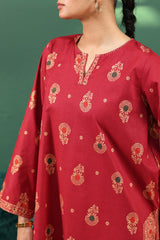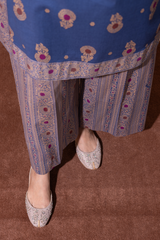 Classic-fit gold-printed shirt with a round neckline and V-slit, adorned with delicate stitching detail. Paired with printed culottes for an effortlessly refined look.