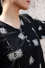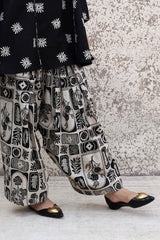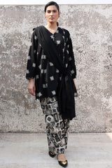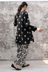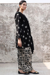 Classic-fit paneled printed shirt with a V-neckline adorned with loop buttons along the front slit, paired with a complementary printed khula poncha shalwar for a graceful look.