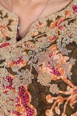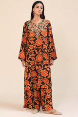 Classic-fit printed shirt with a round neckline and V-slit, adorned with delicate embroidered detail. Paired with matching printed culottes.