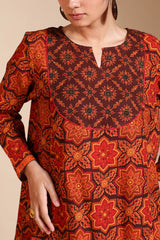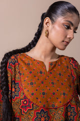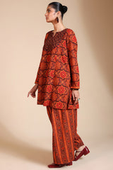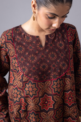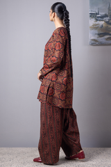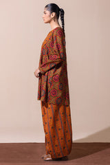 A paneled printed A-line shirt with a round neckline and V-slit, enhanced with dori piping detail on the bodice. Paired with a complementary printed farshi shalwar featuring delicate stitching details along the ankle hemline.