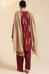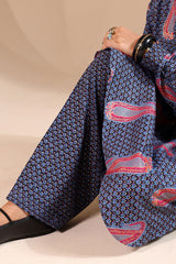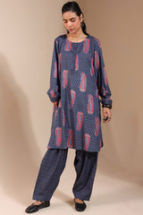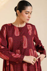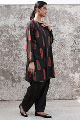 Classic-fit printed shirt with a round neckline and buttoned front placket. Features cuffed sleeves and pleat detailing at the back for a defined silhouette, finished with a round hem. Paired with classic-fit printed shalwar.