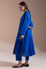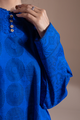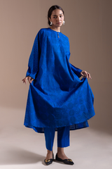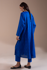 Hand block-printed paneled shirt with a round neckline with loop buttons and pin-tuck detailing along the front placket. Finished with lace trims on the neckline and sleeve hems. Paired with solid straight-fit trousers.