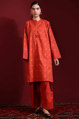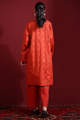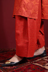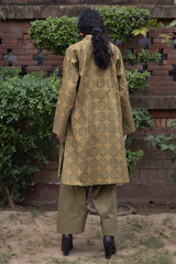 Hand-block printed paneled shirt with a low band neckline and a buttoned front placket, finished with tassel detailing. Paired with a block-printed classic-fit shalwar featuring subtle stitching along the ankle hemline.