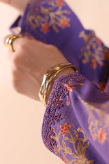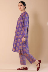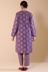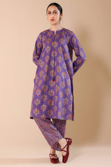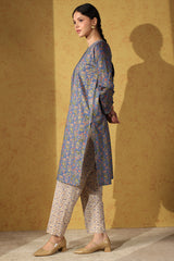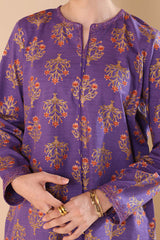 Gold-printed classic-fit shirt with a round neckline and V-slit, adorned with delicate embroidery and tassel detailing. Subtle embroidered accents finish the sleeve hems. Paired with a coordinated printed pegged shalwar.