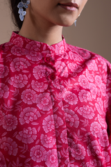 A classic-fit printed shirt with a band neckline and buttons along the front slit, finished with delicate lace detailing on the sleeve hems. Paired with matching printed culottes for a coordinated look.