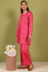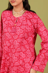 A classic-fit printed short shirt with a round neckline and V-slit, adorned with tassel detailing. Paired with matching printed culottes for a coordinated look.