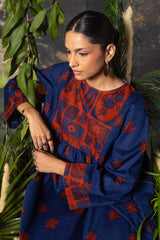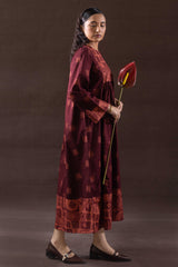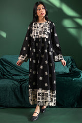 A long flared printed dress with a round neckline and soft gathers, creating a graceful, flowy silhouette. Finished with a keyhole detail and gentle gathers at the back for a classic look.