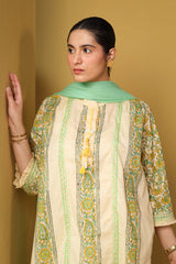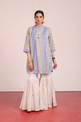 An easy-fit block-printed kurta features a band neckline, braided tassel detailing on the placket, and soft heritage hues in the block print. Ruffle sleeve hems and back gathers add flair. Can be paired effortlessly with any Generation fits for a chic look.