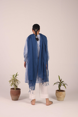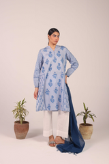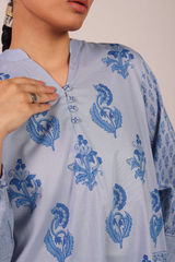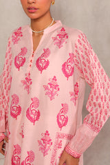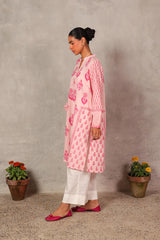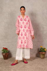 A flared block-printed kurta with a band neckline and V-slit, adorned with delicate buttons on the front placket. The kurta features floral hand-block printed motifs throughout, while subtle pleats at the back provide a graceful drape to the silhouette. This versatile piece can be paired with any Generation trousers for a timeless look.