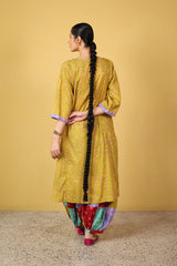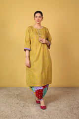 A straight-fit, vibrant Chunri-printed paneled kurta featuring a round neckline with a V-slit. The intricate print showcases a fusion of traditional motifs, dynamic hues, and rhythmic patterns. The placket is adorned with button details and finished with delicate dori piping. Paneled lines are further enhanced with intricate lace trims. Can be paired with any Generation fits.
