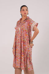 A printed loose-fit shirt with a collared neckline and playful tassel detailing. Designed with drop shoulders and turned-up sleeves adorned with lace accents. Back pleats add a soft, flowy silhouette.