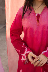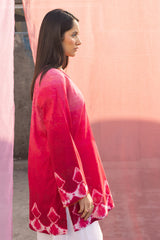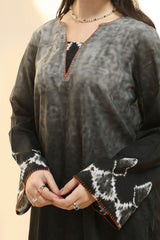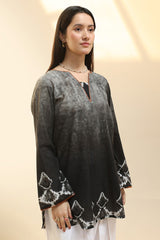 Printed classic-fit shirt with a round neckline and V-slit, adorned with delicate stitching along the neckline and sleeve hems.