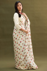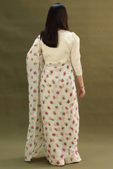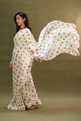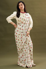 Soft printed saree crafted in a fluid drape, paired with a classic-fit blouse featuring a round neckline and loop-button detailing along the front slit. Designed with soft puff sleeves. Comes with a matching petticoat for a complete, refined look.
