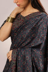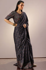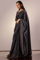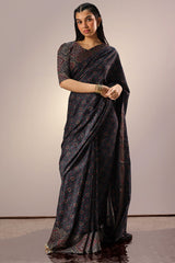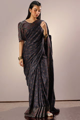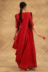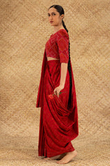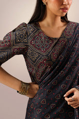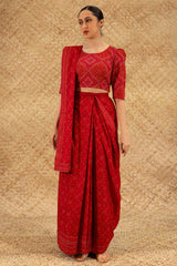 Chunari-printed classic-fit blouse with subtle puff sleeves, styled with a fluidly draped saree adorned with heart motifs and a finely detailed border. Designed with a graceful fall, it offers a traditional yet refined silhouette.